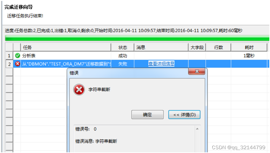 一般从oracle 迁移到 DM7 的时候,出现字符串截断的一般都是字段中含有中文,出 现这种问题是因为 DM7 初始化的时候选择的字符集是 Unicode (即 utf 8 ),该字符集的 国际标准是一个汉字占 3 个字节,而 oracle 中默认情况下一个汉字占 2 个字节,此时迁移 的时候就会报下面的错误: