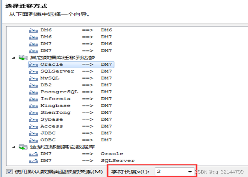 3.因为前面 2 种都需要重新初始化数据库,第三种不需要重新初始化数据库即可解决,即在 选择迁移方式的时候,选择字符长度隐射关系为 2 ,如下图