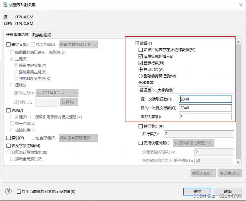 注意:大字段读写取行数,可以适当开启并行。不开快速装载