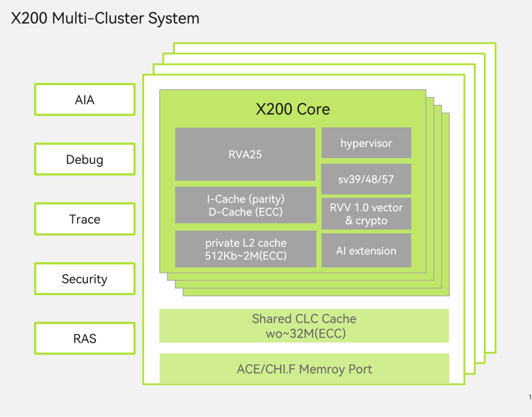 X100已经实现了完整虚拟化、符合云计算场景的安全功能、符合计算机7*24小时稳定工作的RAS特性等。X200在X100的基础上,在完整实现这些功能的同时,也将做进一步增强。重点面向云服务应用场景,通过优化TLB及Walk Cache的组织形式,减少虚拟化多级地址翻译带来的性能损失;扩展Trace以及HPM(高性能计数器)功能,配合自研总线进行系统级优化,提升性能分析、问题定位的跟踪效率;支持更多RAS信息上报,配合全通路CHI总线支持,进一步提升总线的稳定性,配合进迭时空服务器管理固件,能够提升服务器系统可发现错误、可纠正错误、可管理错误能力。