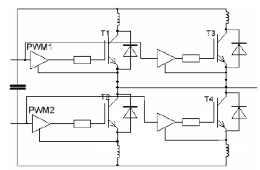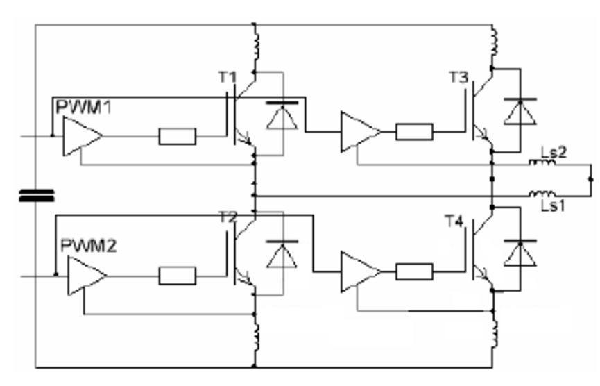 1. 驱动器直接并联对IGBT进行硬并联,则交流输出杂散电感Ls1,Ls2数值会很小,这就要求驱动器的同步性要很高,即从驱动器接收到PWM信号到执行该信号之间的时间差必须足够小,且关键是误差要很窄,稳定性要高;