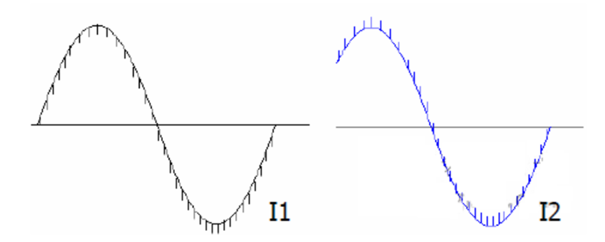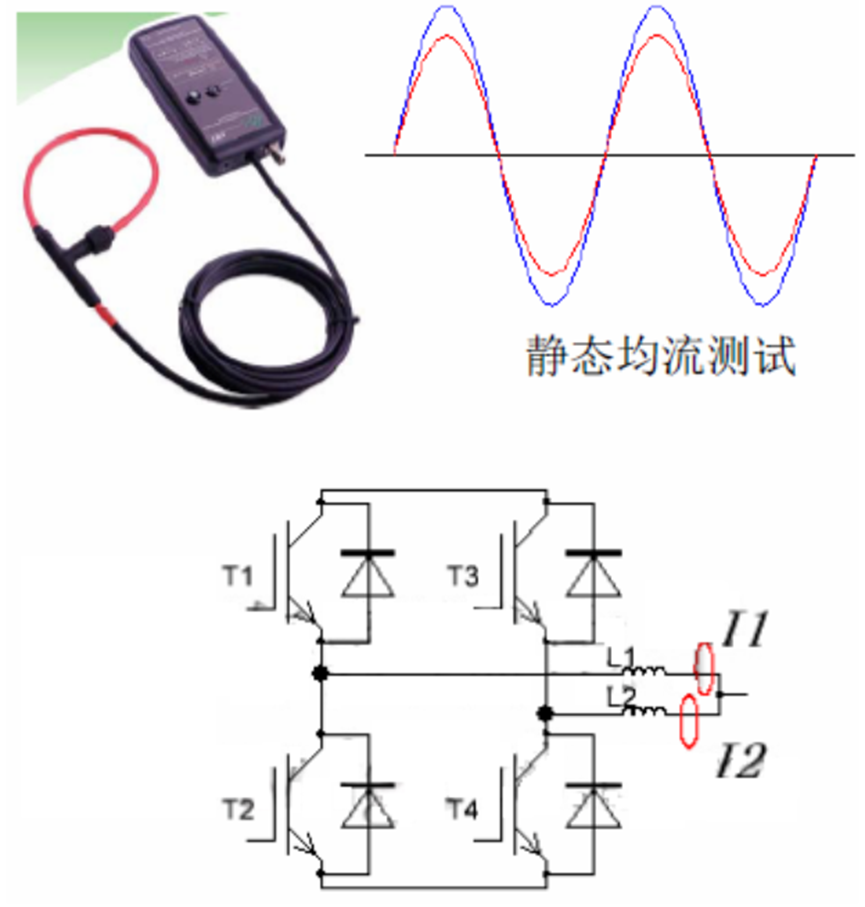 IGBT均流的测试方法: 静态均流测试时,使用柔性电流探头,测桥臂输出电流,测量其电流有效值,考核两桥臂一致程度。柔性电流探头在测量I1和I2时,可能会见到下图的情况。上面的尖刺就是流过L1,L2的换流电流。要想办法消除。