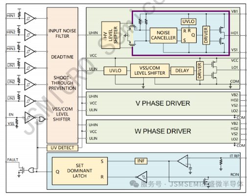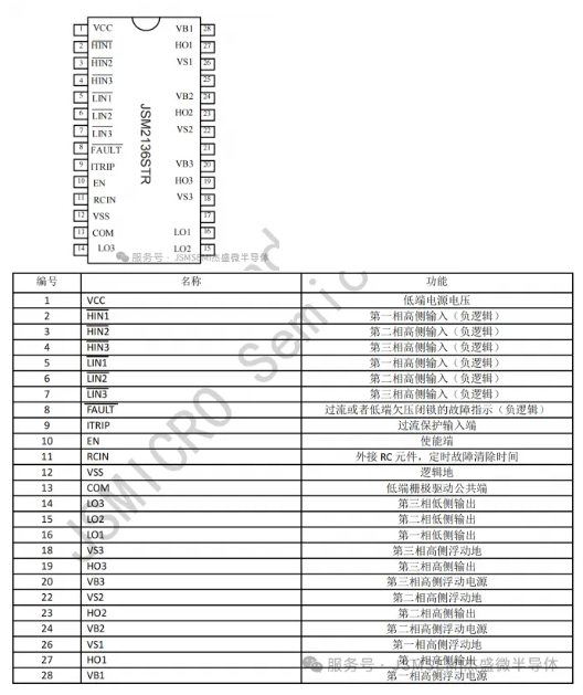 JSM2136S是N型高压、高速功率 MOSFET/IGBT高低侧三相栅极驱动芯片,包含三路独立的半桥驱动电路内部集成了欠压保护和过流保护功能,出现异常时立即关断六通道输出。提供外部使能控制可同时关断六通道输出。通过连接到 RCIN 输入的RC网络在外部编程延时后,过电流故障情况自动清除。逻辑输入电平兼容低至 3.3V 的 CMOS 或 LSTTL 逻辑输出电平,其浮地通道最高工作电压可达700V。可用于驱动N沟道高压功率 MOSFET/IGBT 等器件。 JSM2136S采用SOP-28宽体封装,可以在-40至125温度范围内工作。