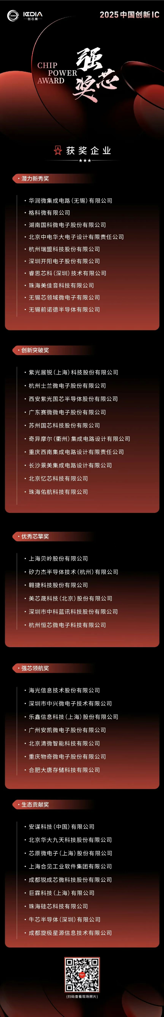 在7月11日的欢迎晚宴现场,由中国集成电路设计创新联盟组织开展的“2025中国创新IC-强芯评选”颁奖典礼隆重举行,现场公布了“2025中国创新IC-强芯评选”的获奖企业。