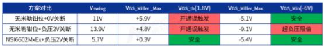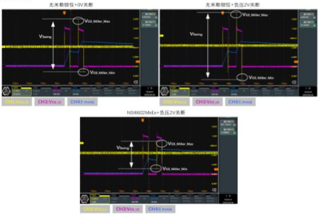 下图展示了某款SiC器件分别搭配NSI6602MxEx和传统无米勒钳位驱动芯片的对比测试结果。在相同驱动参数与layout条件下,NSI6602MxEx能显著抑制正负Vswing,搭配适当负压关断后,可将门极串扰压制至安全范围以内。
