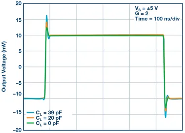 为了更好地阐述上面的观点,图5显示了放大器驱动不同阻性负载的性能差异。图6显示了容性负载引起的小信号过冲,这会影响建立时间和线性度。