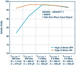 从图8可以观察到,通过提高输入滤波器截止频率,外部放大器可以更快地对采样电容充电/放电,但代价是噪声会提高。例如,在高阻模式开启时,500kHz时的采样噪声小于1.3MHz时的采样噪声。因此,SINAD在500kHZ输入带宽时更好。此外,低通滤波器所需的电容会减小,有助于提高放大器驱动器的性能。