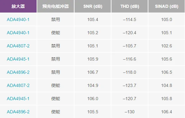 表2. 使用不同放大器的AD7768-1性能