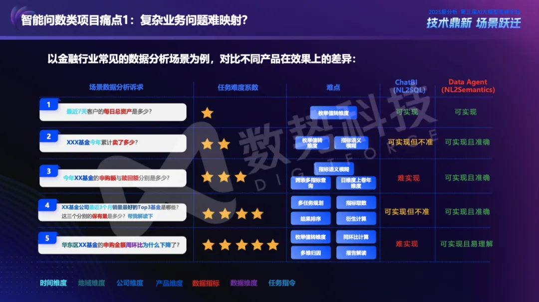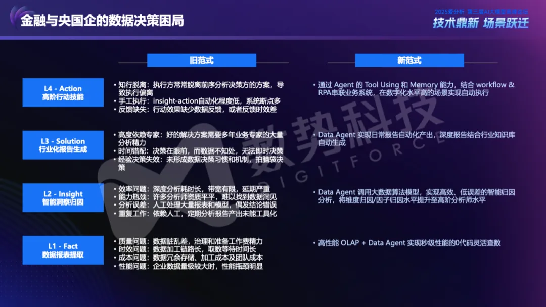 1.首先数据分析领域存在不同层次,许多企业已有数据仓库及BI工具,却仍需落地Data Agent。目前大部分企业的现有数据仓库加BI工具,更多满足的是L1级别的数据提取,仅这一层就有很多机构招聘数百名分析师,以人工方式低效地进行数据提取与报表分析。而在更高层次,没有精力开展指标归因、报告生成等工作。大模型与企业现有数据的融合是重大机遇,因为这能提升数据提取效率,使指标归因更智能,且行业化报告也可通过大模型生成。