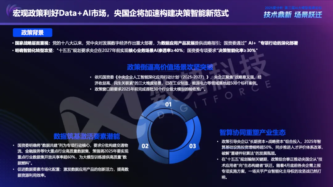 2.从宏观层面来看,国家计划在2027年之前实现AI渗透率超过40%、智能决策化率超过30%,这是大趋势。许多央国企领导在交流中表示,在所有AI Agent的落地场景中,他们会优先选择数据分析,原因在于数据分析与决策的关联性最强。例如,AI Coding及各类创意场景虽可落地,但与企业经营决策、财务等领域并非直接相关,而数据分析恰恰是与企业经营决策最相关的落地场景,这也是众多国企优先选择落地数据分析相关领的原因。