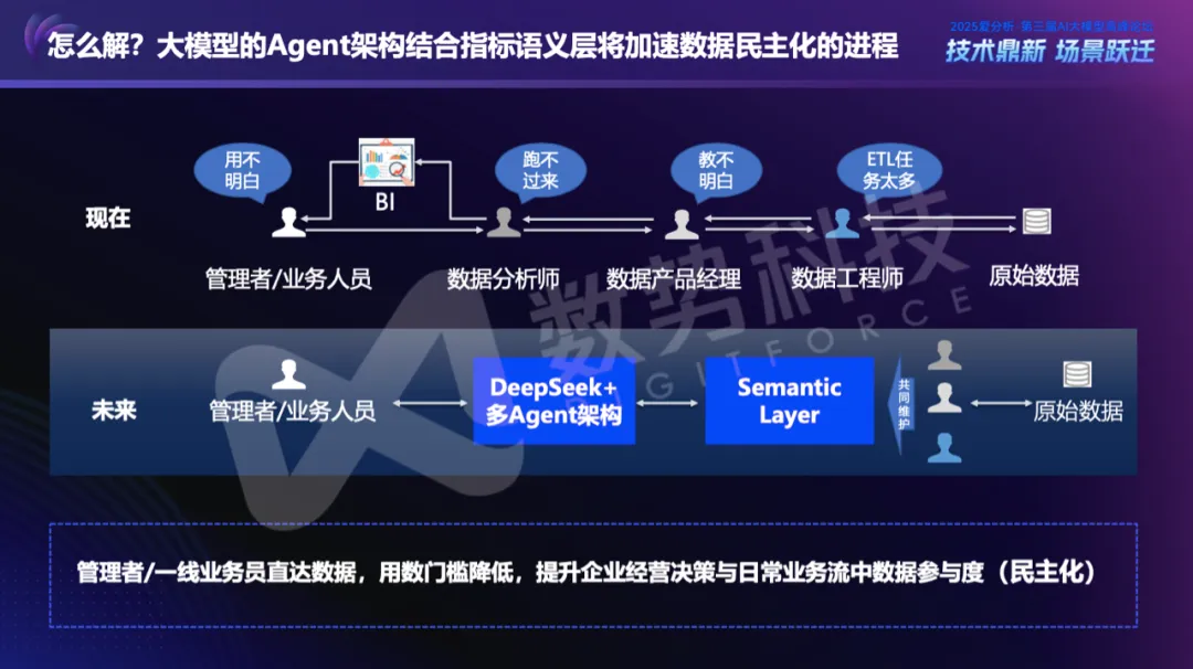 3.Data Agent能够改变企业的数据消费范式。目前众多央国企及金融机构,其现状如上图所示:招聘一批专业数据分析师及数据工程团队,为业务方及领导提供服务。业务方或领导提出报表等需求,交由工程师和分析师处理,这一流程相对较长。但是当企业内部构建好指标的数据语义层后,大模型能更好地理解自然语言需求,无论是撰写报告还是开展分析。这种方式能极大地推动企业内部的数据民主化进程,提升数据消费的效率与价值。