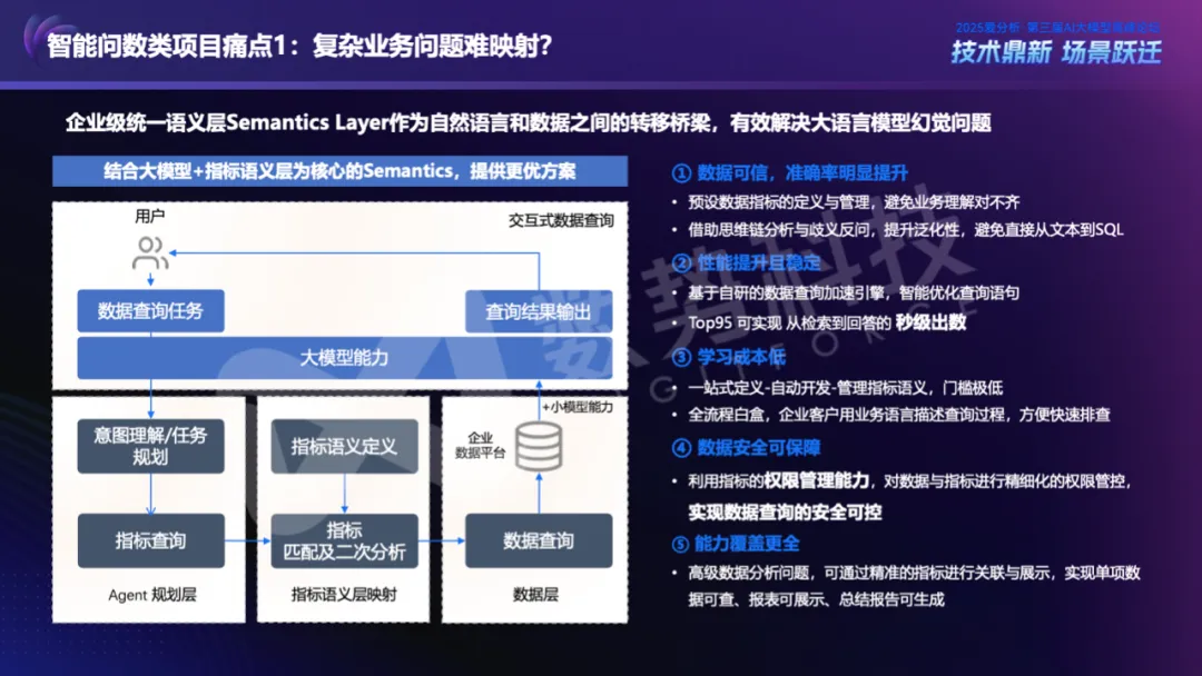 第一,从被动响应向主动洞察跃迁。当前工具如DeepSeek、豆包等,均为被动响应模式,需用户主动提问才给出答案。但企业内部财务、市场营销、供应链等指标繁多,用户难以提前预判哪些指标出现问题。因此,需要大模型主动扫描数据库,提示可能存在问题的指标,实现主动式洞察。