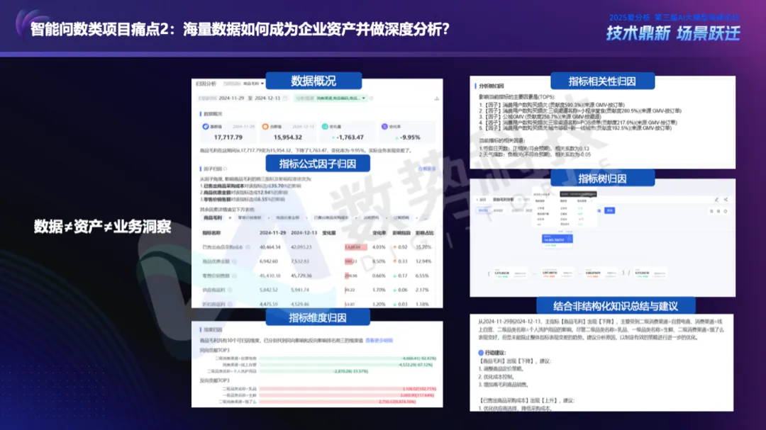 例如,若想查询企业内部利润下降的原因,系统会通过指标归因、因子归因、维度归因等算法能力,解释指标变化的原因。这一能力是企业内部领导真正需要的——不仅要呈现财务数据,还需解释某省份分公司利润下降的原因、外部事件对指标下降的影响,并结合企业内部知识给出建议,如通过何种策略或SOP进行优化。