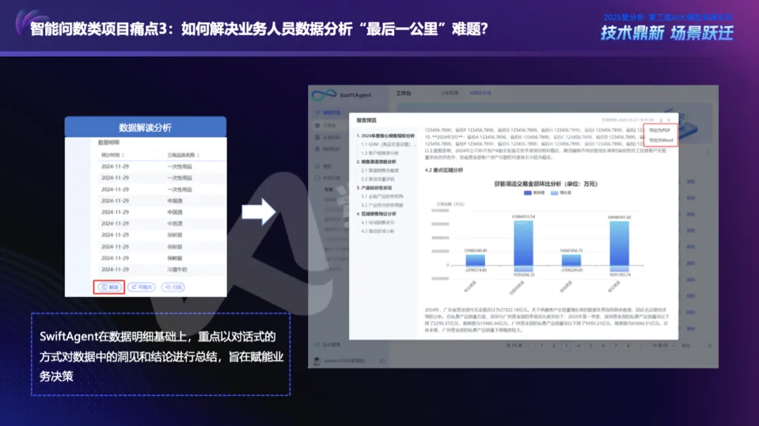 以某国央企为例,其以往人工撰写报告需两天,且效果不及系统生成;如今15分钟内即可完成,财务部门得以从冗余的查数、写报告工作中释放出来。只要模板设定完成,15分钟内即可生成报告,且可导出为Word或Excel进行编辑。其优势在于适配汇报场景,能融合指标体系、挖掘数据洞察并呈现给用户,这是解决业务最后一公里的核心功能。