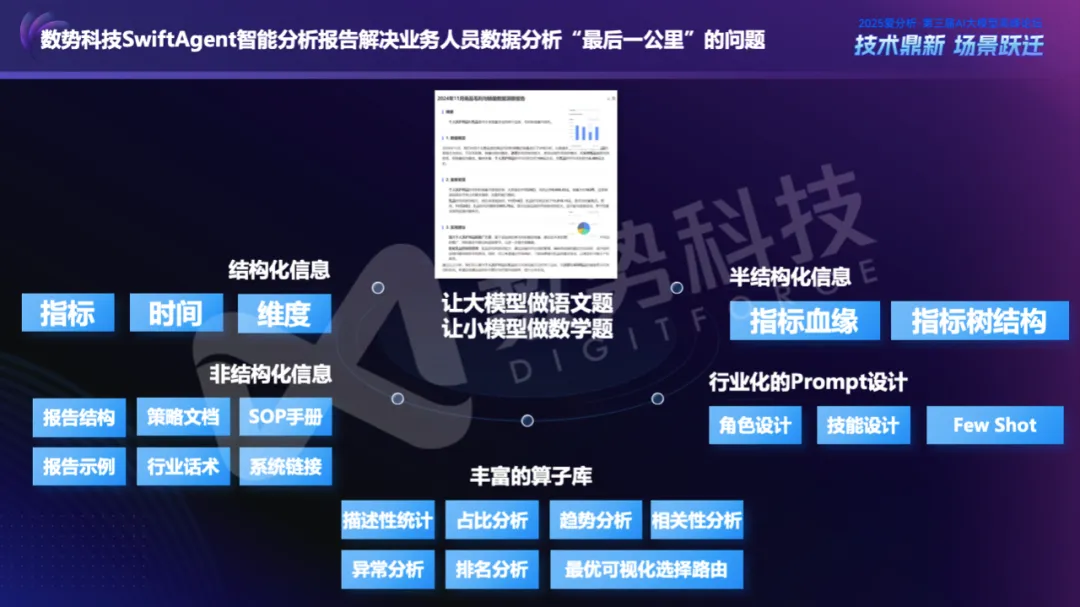 具体方法是撰写完整的数据复盘报告,在数势科技产品体系内包含五个核心要素,第一个模块是结构化指标及指标间的关系,这一层面至关重要,还需为其设计行业化提示词及提供半截化信息。例如,企业内部报告的撰写方式,以及报告中会用到的同环比分析、趋势分析等算法算子库,让大模型理解这些背景信息后,自行组合技能、指标及元信息生成报告,这是底层核心要素。