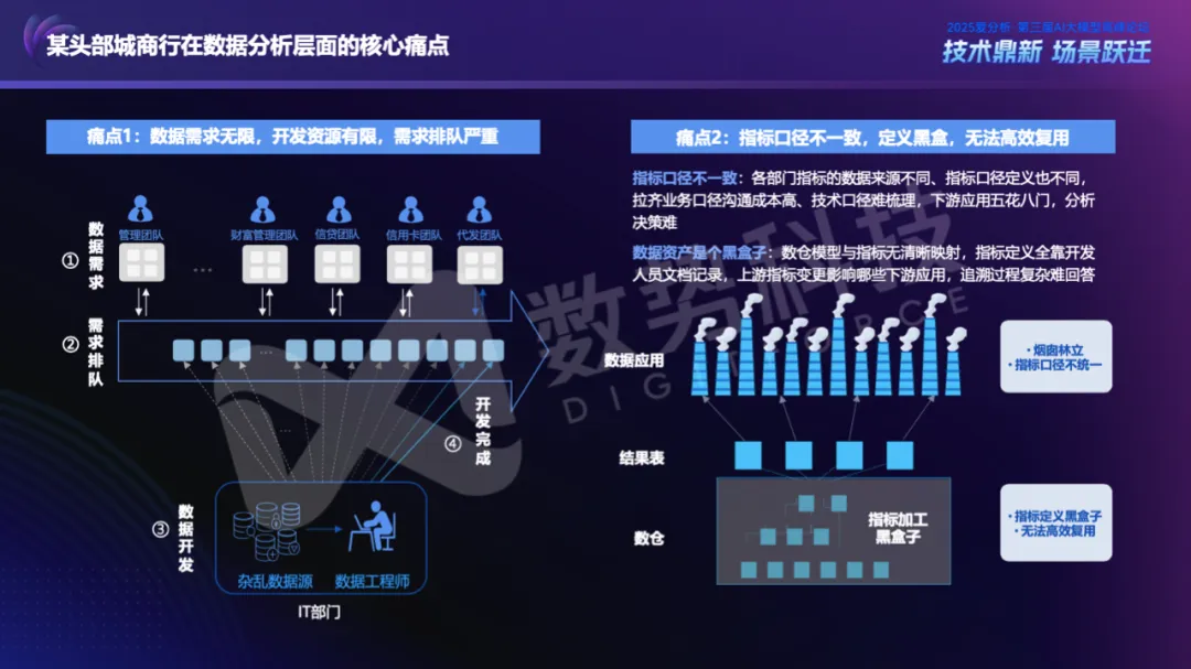 案例一:某大型国央企银行面临的主要问题是数据团队难以支撑众多业务部门的需求:其数据分析团队有200人,而业务方达上千人,无法通过招聘等量分析师满足需求,且指标混乱。