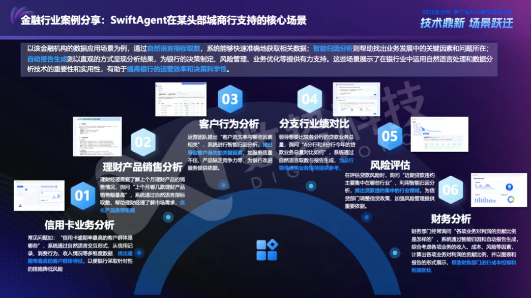 对该行领导而言,最重要的模块是对指标本身进行解释。例如,若某分行指标下降,可通过大模型调用归因小模型算法,明确指标变化的核心原因,如某分支行、某类产品、客户或贷款出现异常。通过大小模型协同,直接向用户呈现指标背后的原因,使用户不仅知晓指标数值,还能了解可能是哪些分支行的指标存在问题,从而开展针对性优化。这是该机构的核心使用场景。