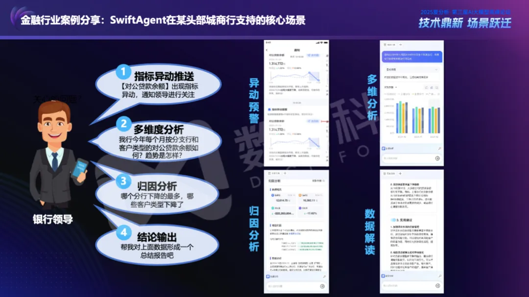 银行领导使用产品的方式是:系统会主动推送信息,例如提示北京某分支行网点出现问题需关注,领导通过自然语言交互查询数据明细、对数据异常原因进行归因分析总结并生成报告。这种使用流程与传统BI工具完全不同,以往培训领导使用BI工具可能需要一个月,且对方未必愿意使用,而现在的交互如同微信聊天,以纯自然语言形式提供数据洞察能力。