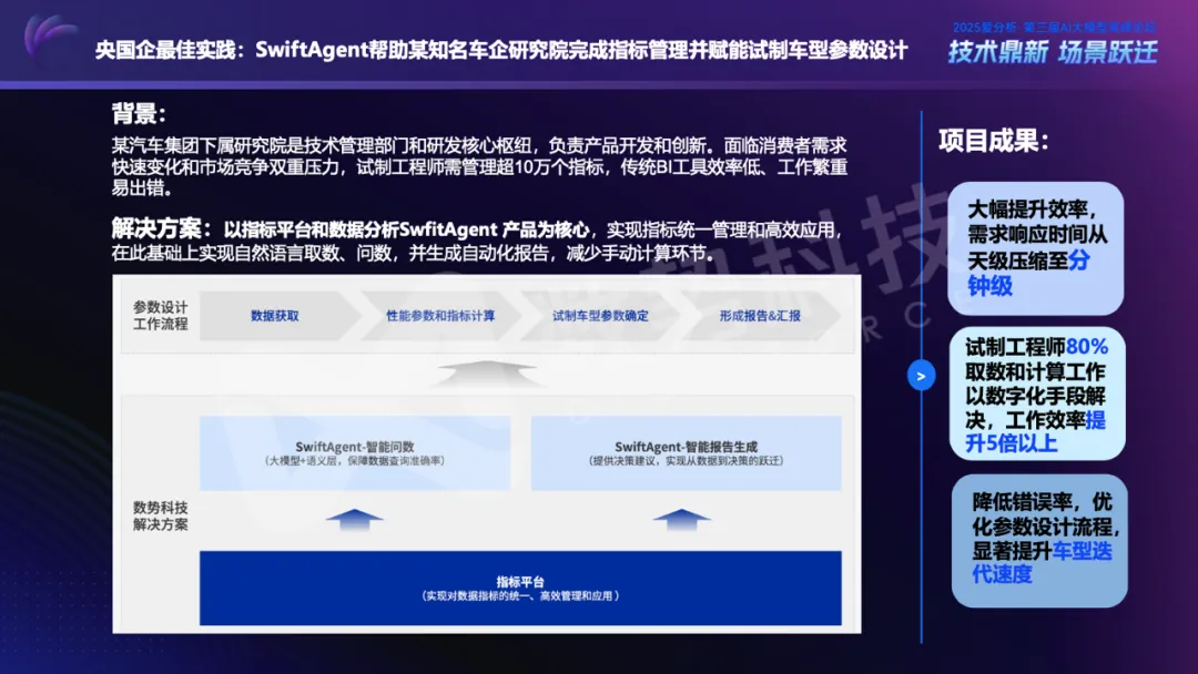 案例二:某国央企性质车企,其痛点在于车型试制场景涉及10万个指标,需通过指标分析组合辅助新车型研发。数势科技搭建指标体系并提供智能问数功能后,试制工程师的日常取数及计算时间减少80%,工作效率提升5倍以上,同时加快了该车企新车版本的迭代速度。