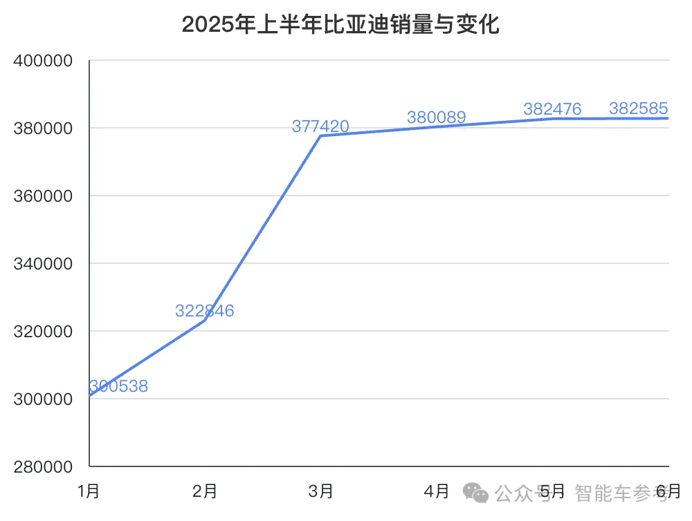 2025年,自主三强格局出现变化。比亚迪依然一骑绝尘,6月卖出382585辆车,同比增长12%,环比基本不变,上半年销量已突破200万辆,累计达214.6万辆。