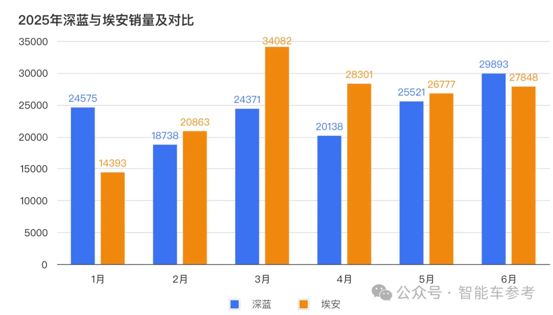 再来看传统车企孵化的新势力,深蓝在6月超过了埃安,6月销量为29893辆,上半年累计销量突破14万辆,累计销量稍稍落后。