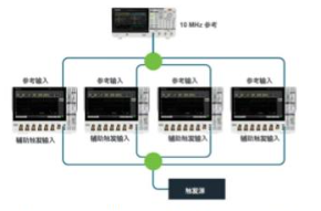图 2:4台泰克 MSO5B 示波器级联系统架构图,展示触发信号分配与同步机制