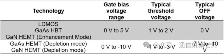 设计者还应考虑,在电路施加漏极偏置之前,PA晶体管需保持在截止状态。这对于HEMT器件尤为重要——此类器件在零栅极偏置时完全导通,因此需要主动关断(表1)。偏置控制器还通过PA使能线集成了时序逻辑,该逻辑仅在漏极电源发生器的“电源正常”逻辑激活漏极电压后,才会触发PA使能信号。此外,对于耗尽型HEMT,漏极电压应在负电源(栅极偏置)施加之后再激活,以确保晶体管处于截止状态。