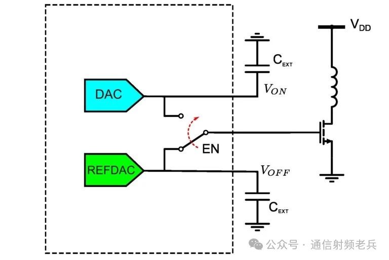 图2. 利用单SPDT开关(使能信号)和两个DAC实现PA的快速切换,分别生成导通和截止电压,每个电压都存储在外接电容器CEXT中。