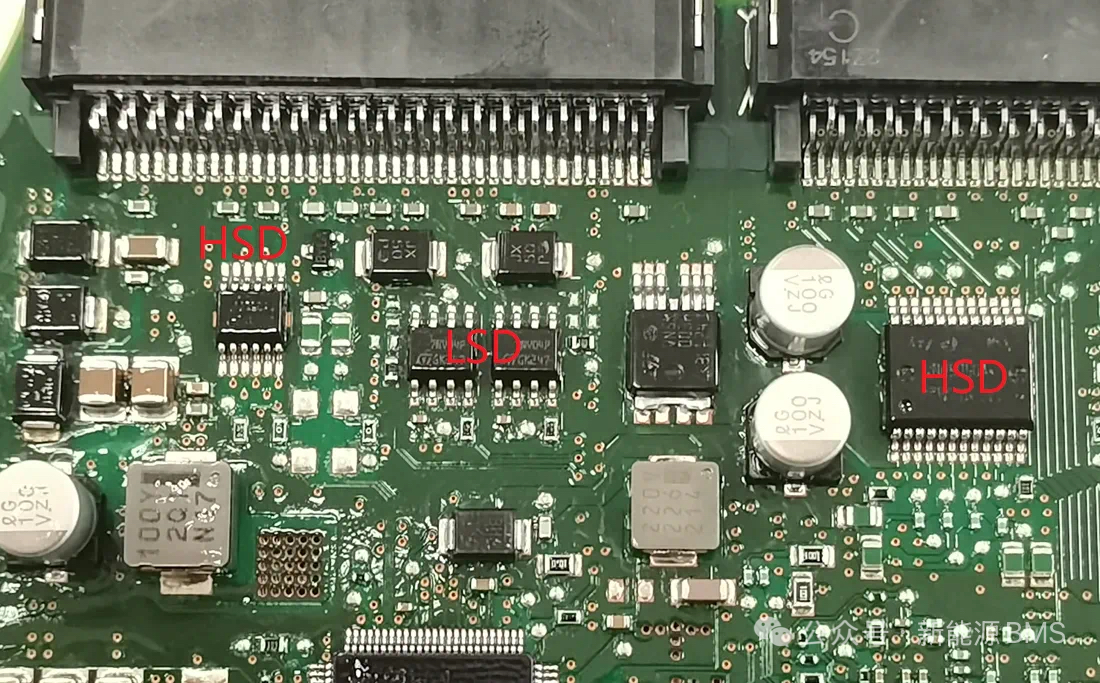 单板上有三处明显的高低边驱动电路,如下图:左边这个HSD芯片供电来自于KL30,其型号为ST的VND5160,为双路高边输出;中间为两个LSD芯片,是来自于ST的VNS7NV04P-E;右边的HSD芯片供电来自于前面的继电器供电电源,具体型号为ST的VNQ5050AK,集成了4路高边开关。