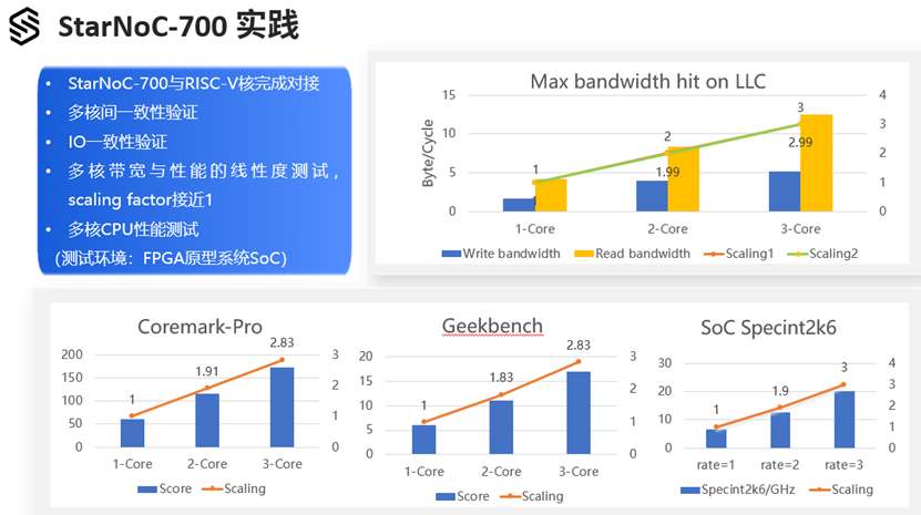 在实践层面,StarNoC-700已与赛昉自研的高性能RISC-V核Dubhe-70/Dubhe-83完成适配,并搭建了多核一致性互联的验证平台。测试结果显示,在多核场景下,StarNoC-700的性能表现接近线性增长,总线吞吐量测试也展现了优异的扩展性(Scaling factor接近1)。