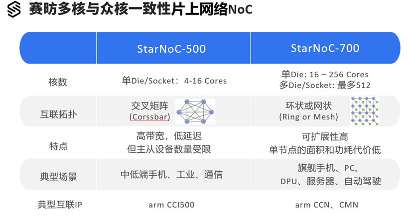 据悉,StarNoC-500采用交叉矩阵拓扑,支持4-16核配置,主打高带宽和低延迟,适用于中低端手机、工业及通信领域。而StarNoC-700则采用环状或网状拓扑,单Die支持16-256核,多Die扩展可达512核,具有更高的可扩展性和能效表现,目标场景包括旗舰手机、PC、服务器及自动驾驶。