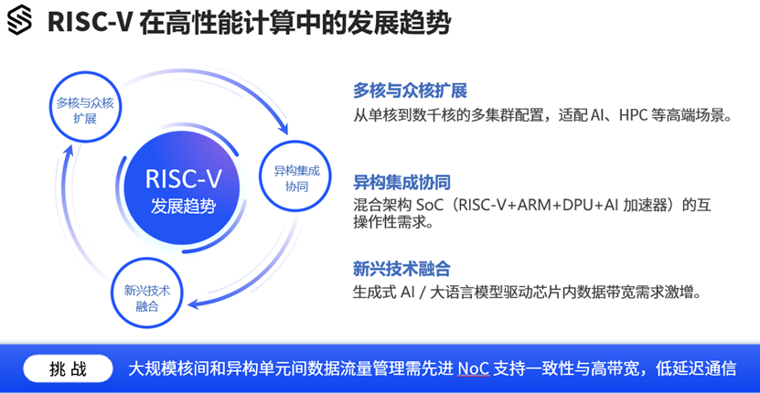首先,多核与众核扩展成为主流,从单核到数千核的多集群配置逐渐普及,以满足AI和HPC的算力需求。其次,异构集成协同需求凸显,混合架构SoC(如RISC-V与ARM、DPU、AI加速器的组合)需要高效的互操作性。最后,新兴技术融合(如生成式AI和大语言模型)对芯片内数据带宽提出了更高要求。