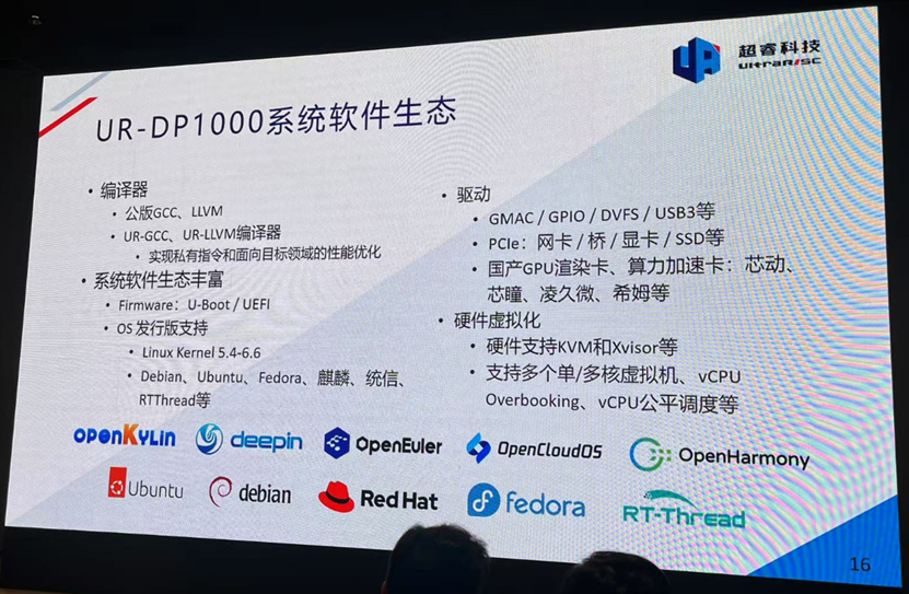 在生态建设方面,UR-DP1000的软件生态覆盖主流开源工具链与操作系统,支持GCC/LLVM优化编译、Linux发行版及国产化系统,并实现KVM虚拟化低开销(~3%)。