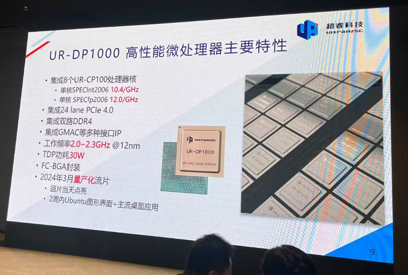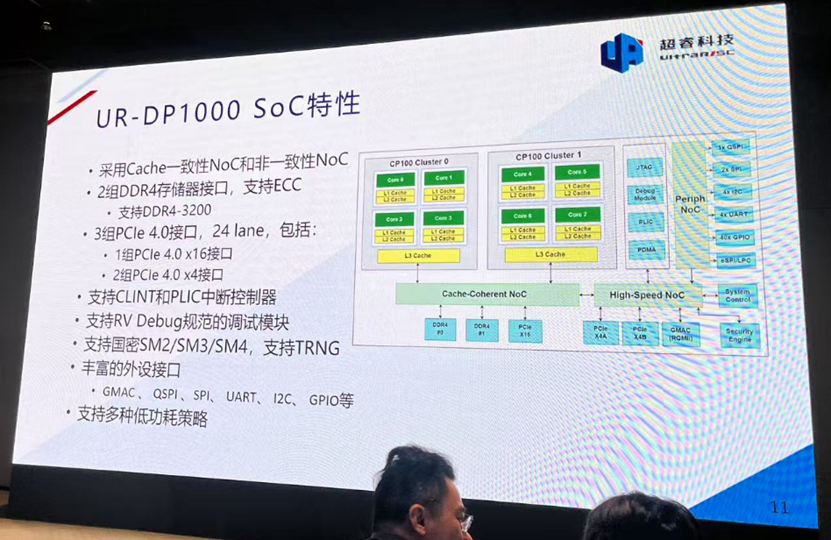 蒋江在会议期间重点介绍了UR-DP1000高性能微处理器芯片、性能,以及围绕UR-DP1000的系统软件生态及应用情况。