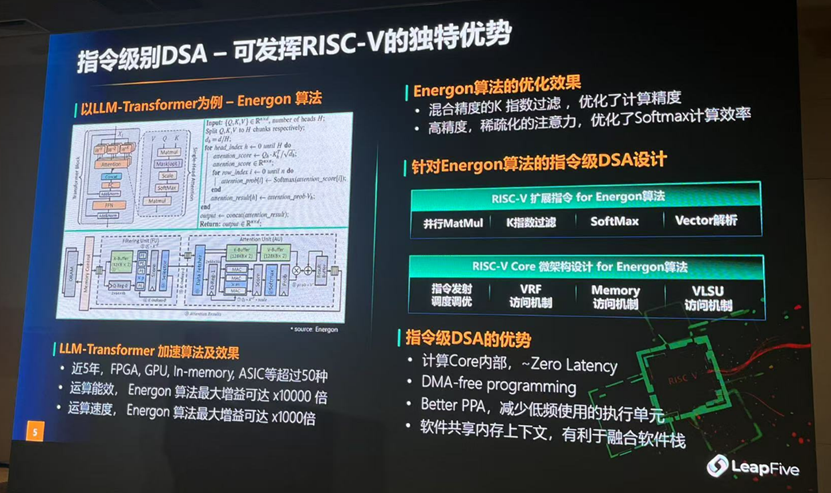 “以Energon算法为例,通过RISC-V扩展指令集对矩阵乘法(MatMul)、SoftMax等操作进行硬件级加速,可实现高达10000倍的能效提升和1000倍的运算速度增益。这种指令级DSA设计在微架构层面可进一步优化指令发射调度和内存访问机制,实现近乎零延迟的计算效率。” 袁博浒解释道。