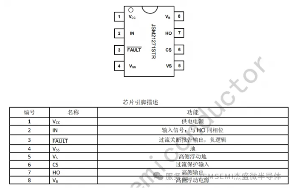 JSM21271其浮动通道可用于驱动高压侧N沟道功率 MSFET,浮地通道最高工作电压可达300 V。JSM21271采用 SOP-8封装,可以在-40℃至125℃温度范围内工作。