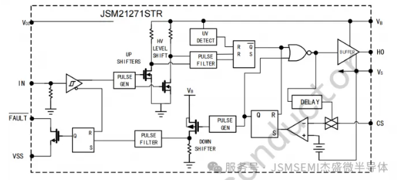 JSM21271是一组带过流检测的高电压、高速单通道高侧 MOSFET/IGBT 驱动芯片。JSM21271采用高低压兼容工艺使得高侧栅驱动电路单芯片集成,逻辑输入电平兼容低至 3.3V的CMOS 或 LSTTL 逻辑输出电平。内置高侧过流保护电路,当检测到过流状态时,关断芯片输出,同时,一个漏极开路的FAULT端口输出错误信号。