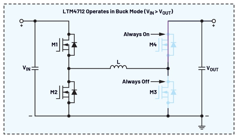 该款四开关降压-升压转换器可以轻松配置为降压转换器,无需任何特殊调整。当VIN > VOUT时,内部控制器会让功率FET M3保持关断,而M4保持导通。M1和M2会调节输出,就像标准降压转换器一样运行,如图2所示。与之前的降压稳压器LTM4613相比,尽管M4引入了额外的传导损耗,但新器件仍然实现了更高的能效比,如图3所示。这一改进是MOSFET和电感技术进步的结果。