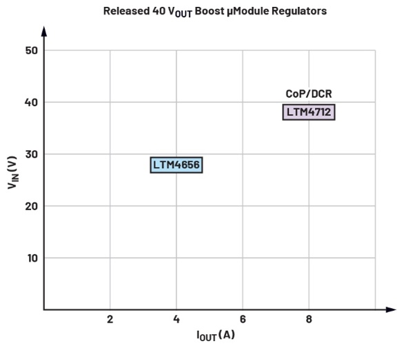 ADI公司推出了多款40 V降压型µModule稳压器。图1重点展示了最大负载电流在 4 A以上的几款现有稳压器,但这些降压型稳压器支持的电压和电流范围有限。采用新推出的四开关降压-升压型µModule稳压器LTM4712作为降压转换器,可以显著拓展工作范围,从而简化客户的系统设计。