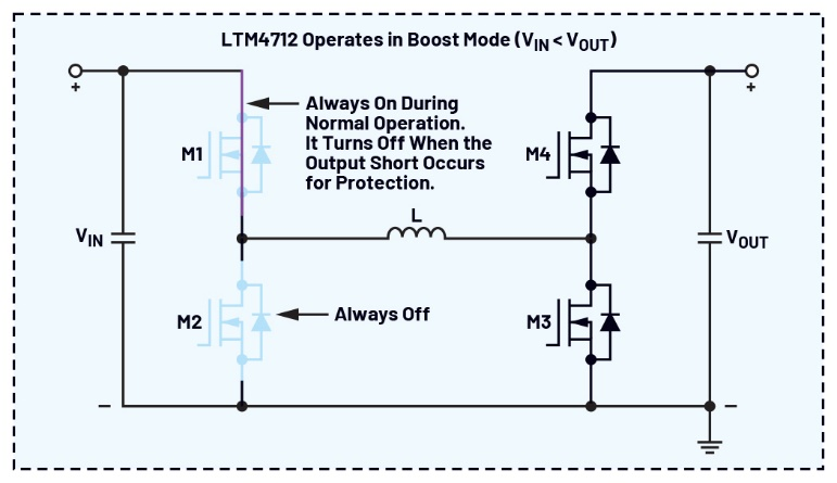 在VIN < VOUT的应用中使用该款四开关降压-升压转换器时,内部开关M1保持导通,而M2保持关断。M3和M4会自然地调节输出,就像典型升压转换器一样,如图5所示。与缺乏输出短路保护的标准升压转换器不同,该款四开关降压-升压转换器具备固有的短路保护功能。如果输出短接到地,M1和M2将像降压转换器一样切换,限制从输入流到输出的电流。最大短路电流受输入或输出路径中的RSENSE电阻或峰值电感限流值(以较低者为准)的限制。此外,在初始VIN快速上升阶段,常规升压转换器通常会有不受控制的高冲击电流通过升压二极管,对COUT充电。该款四开关降压-升压转换器在VOUT较低时始终以降压模式启动,因此其输入冲击电流受到电感电流软启动的严格控制和限制。总之,相比常规升压调节器,该款四开关降压-升压转换器可实现更可靠的升压转换器。