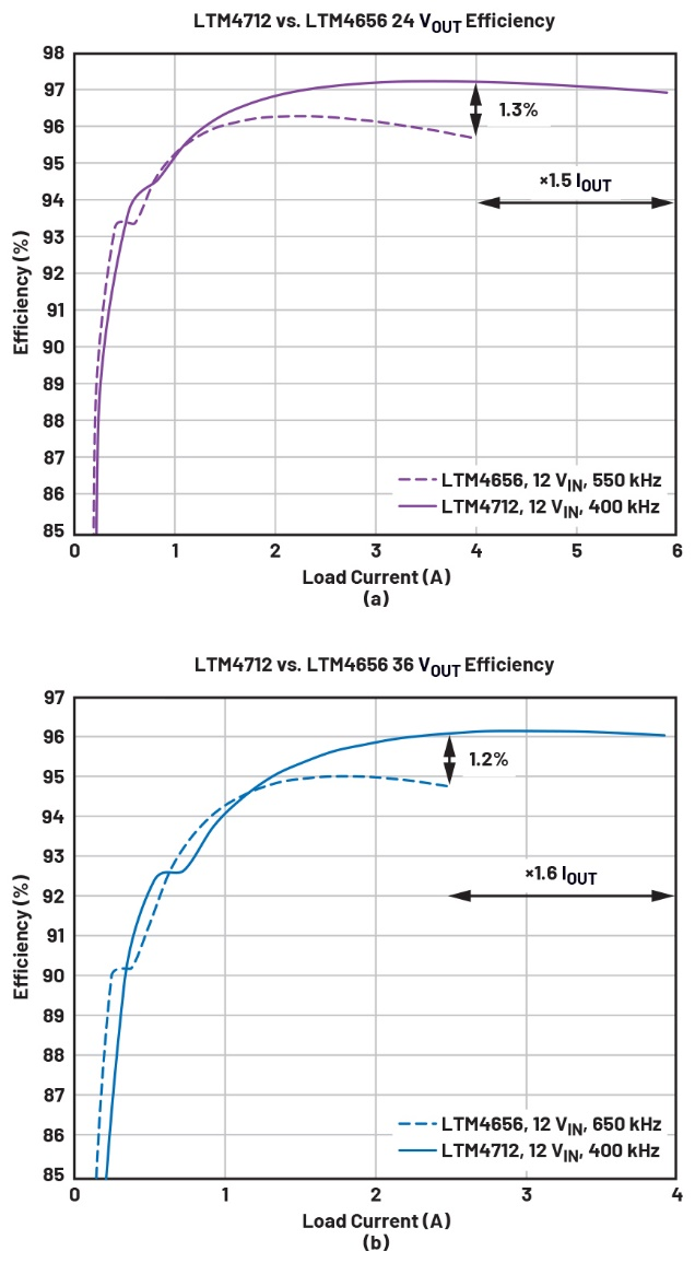 图3.降压模式效率和电流能力比较:(a) 5 VOUT效率,(b) 12 VOUT效率。