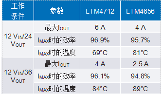 图6和表2比较了该款四开关降压-升压型µModule稳压器与降压型µModule稳压器的效率、功率能力和热性能。第一款器件表现出优越的效率、更大的电流处理能力和明显更好的热性能。两款稳压器尺寸相同,均为16 mm × 16 mm。