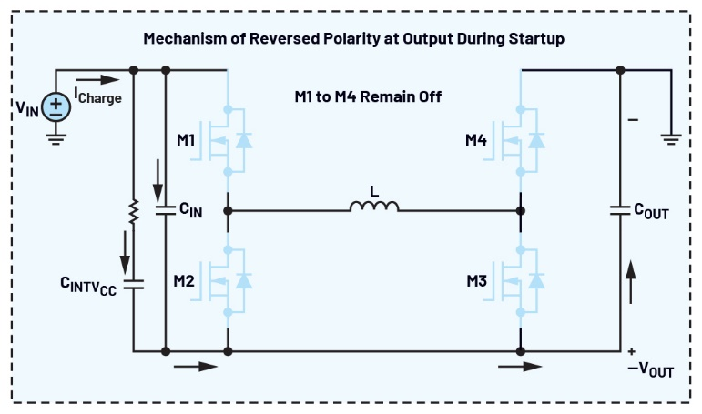 图10展示了启动期间输出电压反向的原理。在输入电源接通后,但在所有四个MOSFET开始切换之前,输入电流开始通过两条路径反向对输出电容充电:其一是通过跨接在M1和M2上的CIN去耦电容,其二是通过INTVCC电容路径。如果CIN或CINTVcc明显大于COUT,则可能出现更高的反向输出电压。