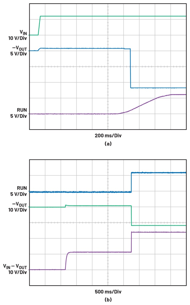 图12显示了启动期间基准平台测试的反向输出电压波形。在图12a中,反向-VOUT的幅度约为+0.75 V,与COUT (330 µF)相比,电路中的CIN (50 µF)有限。将CIN增加至350 µF时,观察到反向-VOUT升高至+1.5 V,如图12b所示。