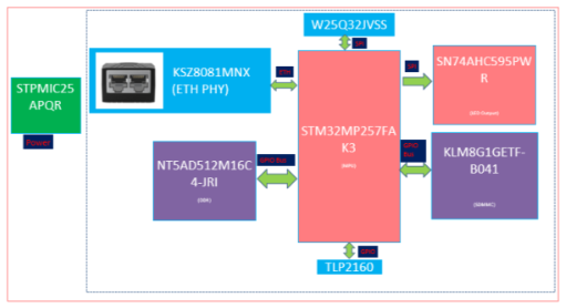 - STM32MP257FAK3 MPU:双Arm® Cortex®-A35@1.5GHz、Arm®Cortex®-M33@400MHz、3×Ethernet(2+1 switch)、3×FD-CAN、LVDS/DSI、H.264、3D GPU、AI/NN、Secure Boot、Cryptography、DRAM enc/dec、PKA;