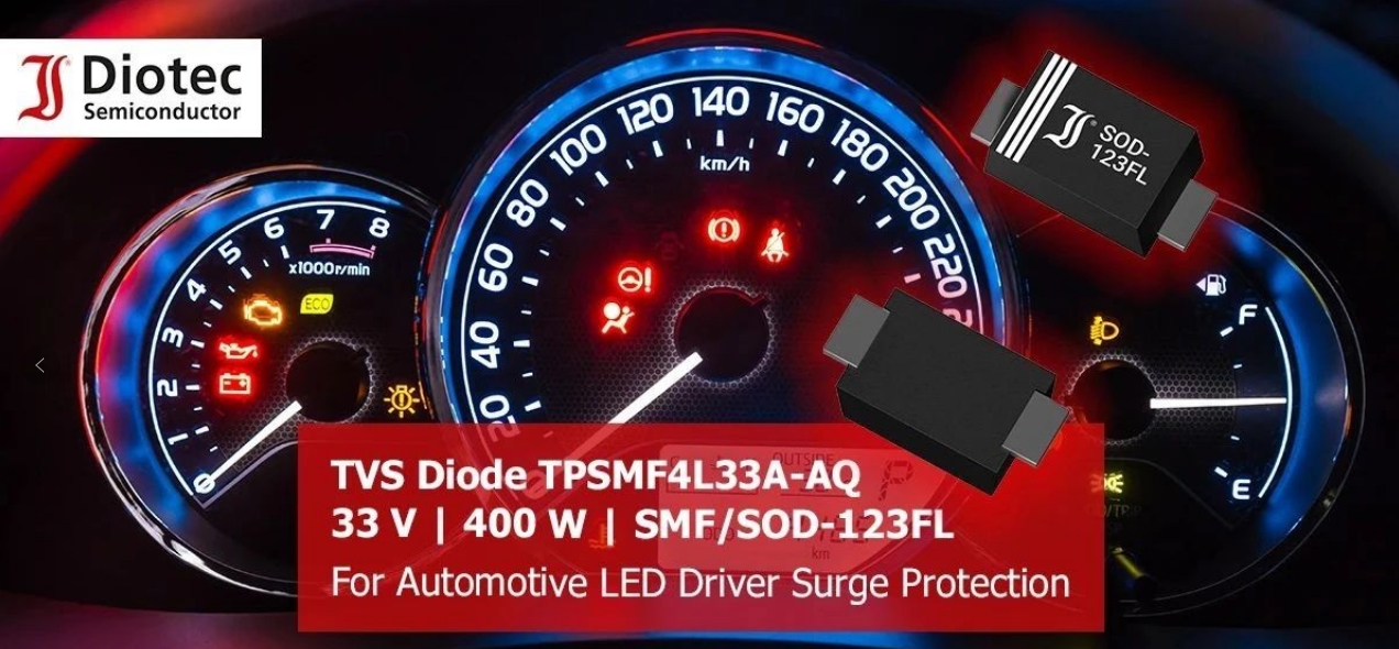 德欧泰克半导体的TPSMF4L33A-AQ是一种400W的浪涌保护器,采用小型SMF/SOD-123FL封装。它完全符合汽车标准AEC-Q101。其反向漏电流保持在1µA以下,钳制电压低于53.3V,能够安全地保护任何类型的RGB车内LED驱动电路。