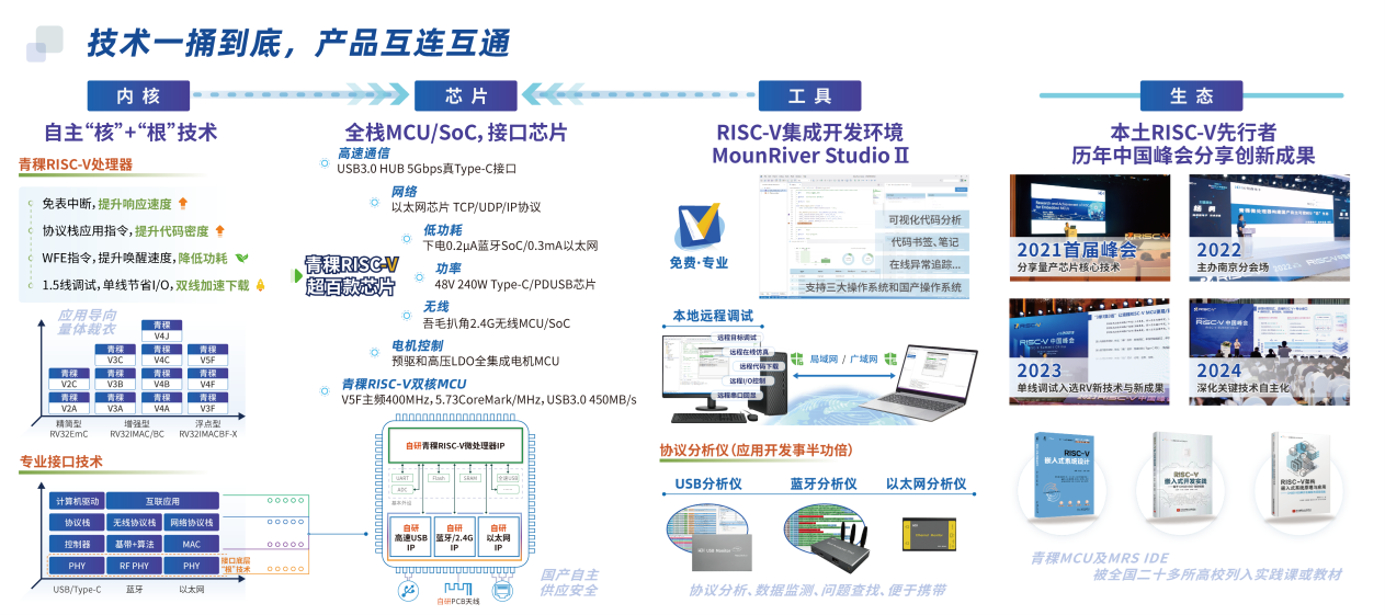 沁恒通过自研专业接口技术为MCU赋能,多层次青稞RISC-V处理器“核”技术与高速USB、Type-C PD、以太网、蓝牙等接口底层PHY“根”技术的灵活组合,孕育出面向高速通信连接、无线组网互联、Type-C电源功率管理、电机控制等不同侧重、具有明显接口特征的MCU产品。芯片内置专业接口功能多、中断响应快、一体化功耗低、免除第三方授权费和提成费成本省,即“多·快·少·省”,助力RISC-V在下游互连互通领域开枝散叶,赋能千行百业。