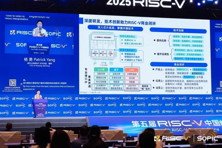峰会现场,沁恒在主会场圆桌讨论环节分享了青稞RISC-V的成熟商用经验,并在主会场发表了《扎深根、结硕果,青稞RISC-V的技术创新与商业闭环》的主题演讲,系统性地介绍了青稞RISC-V的发展历程、技术创新和生态建设成果,分享了沁恒自研处理器“核”技术与收发器“根”技术,用跨领域技术交叉与一体化芯片设计增强产品特色、加速RISC-V应用落地的商业闭环经验。