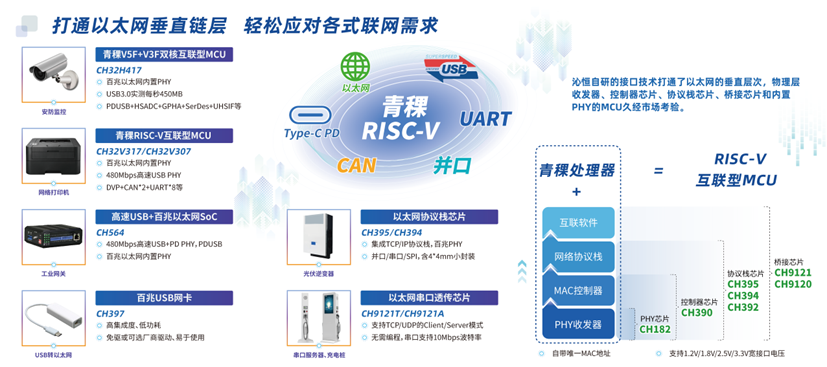 沁恒自研的接口技术打通了以太网的垂直层次,物理层收发器PHY、控制器芯片、协议栈芯片、桥接芯片和内置PHY的MCU等产品久经市场考验。