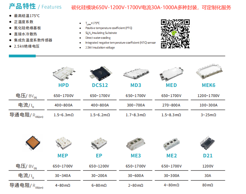 4. 参数范围: VDS:650~1700V ID:30~600A RDS(on) :2~80mΩ